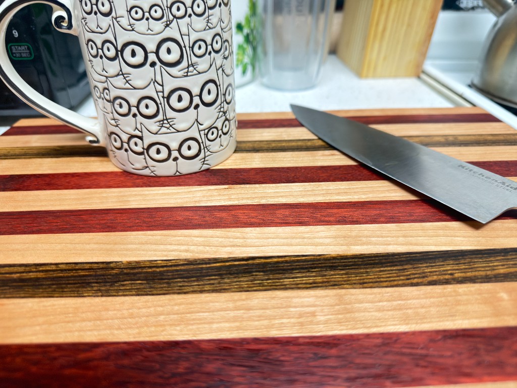 B's Boards started when a friend who's a woodworker showed me the ropes. I buy the lumber myself—species, figure, and contrast—so every glue-up is something I'd be proud to hand someone at a holiday dinner.